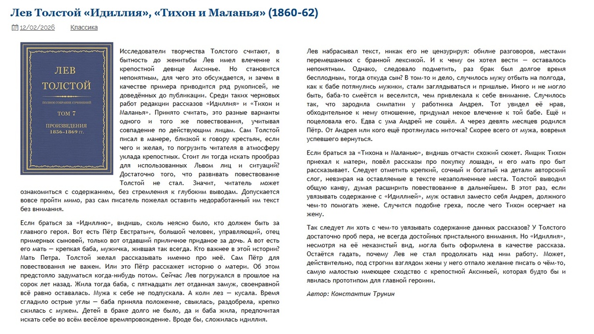 Лев Толстой «Идиллия», «Тихон и Маланья» (1860-62) | Критика