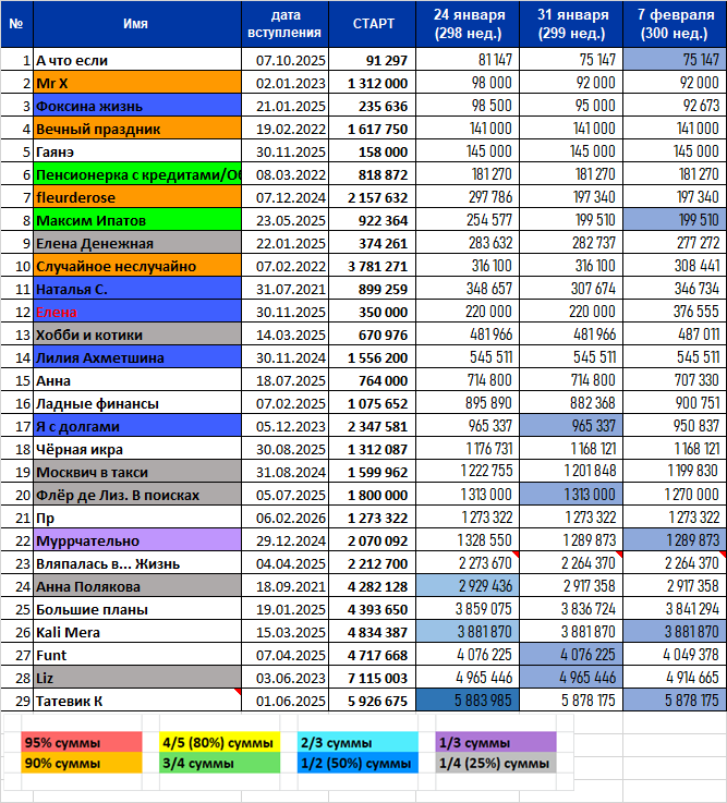Всем привет! В очередной раз прошу прощения за задержку результатов. Знаю, все ждут. Но у меня загруз на работе, плюс я занята подготовкой к 23 февраля... Мало того, что времени не хватает, так ещё и все эти действия проходят перед компьютером, и хочется просто отдохнуть глазам. Но про марафон я помню, и как только появилось свободной время, спешу представить вам наши итоги: Вначале - общая таблица, снова похудевшая на одну строку: На скамейку запасных отправилась Мадемуазель Полина, как я и предупреждала двумя неделями ранее. И сейчас в марафон может вступить новенький (напомню, что по очереди у нас идут Дневник трат, Галина L, и теперь уже снова Мадемуазель Полина). Кто желает присоединиться к марафону пишите! А теперь перейдем к нашим кубкам. Самые большие суммы на этой неделе погасили следующие участники: Liz погасила 50781р и заняла первое место! На втором - Флёр де Лиз. В поисках с суммой 43000р, а на третьем - Funt с результатом 26847р. Поздравляем! А вот кто погасил больше всех