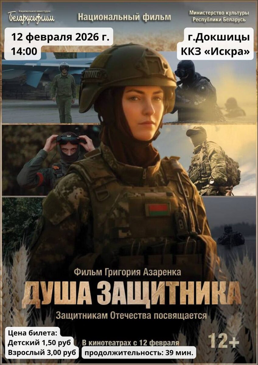 🎥Сегодня в стране состоится премьера фильма Национальной киностудии «Беларусьфильм» «Душа защитника» 🪖39-минутная лента режиссёра и тележурналиста Григория Азаренка раскрывает, в чём секрет силы тех, кто отдаёт всего себя защите Беларуси и каково это стоять на страже безопасности страны в один из самых напряжённых моментов её истории? ⭐️Фильм в неигровой форме снят при поддержке Министерств обороны и внутренних дел, а также Государственного пограничного комитета Беларуси. Съёмки ленты заняли около полугода, на монтаж ушло ещё два месяца. 🗡В главных ролях — бойцы и командиры Вооружённых Сил Беларуси, пограничных войск, внутренних войск МВД Беларуси. Для зрителей они предстанут в разных ракурсах: и в уникальных кадрах решения боевых задач, и в обычной, мирной жизни. 😊Показ фильма запланирован и в Докшицах. 📌ККЗ "Искра", 14:00 ________________ Сайт | Instagram | VK | OK | TikTok |Telegram | Чат-бот