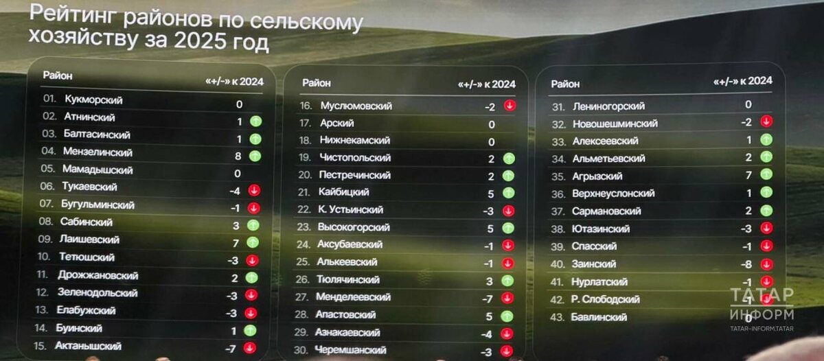Татарстанның Авыл хуҗалыгы һәм азык-төлек министрлыгы терлекчелек, үсемлекчелек, хезмәт хакы, тулай продукция күләме буенча елдагыча районнар рейтингын төзегән. Лидер районнар арасында Кукмара, Әтнә, Балтач - беренче өчлектә. Бу хакта «Татар-информ» хәбәр итә. «Алар үз позицияләрен саклап килә», - диде йомгаклау коллегиясе утырышында ТР Премьер-министры урынбасары - авыл хуҗалыгы һәм азык-төлек министры Марат Җәббаров. Министр сүзләренчә, алдынгы районнар үз потенциалын да үстерә, производство нәтиҗәлелеген дә тәэмин итә. «Аларның тәҗрибәсе хәзерге шартларда да үсеш мөмкинлекләре булуын раслый», - диде.