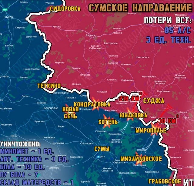 В группировке войск «Север» ВС РФ, создающей полосы безопасности в Харьковской и Сумской областях, рассказали об изменении текущей обстановке на линии фронта у границ Курской области. 12 февраля на всех участках фронта на Сумском направлении продолжались ожесточенные бои. Интенсивно работала артиллерия Северян, обеспечивая продвижение штурмовых подразделений вглубь Сумской области. Оно отмечено на 17 участках в Глуховском, Краснопольском и Сумском районах. Авиация ВКС РФ и «Герани» точечно наносили удары по выявленным позициям ВСУ. Противник наращивает количество расчетов БПЛА на передовой, пытаясь атаковать гражданские объекты в Курской и Брянской областях. Активизированы информационные операции ВСУ, чтобы убедить население Украины в каких-то успехах на фронте в Сумской области. Это фальшивая установка флагов и заявления о том, что российская армия пытается пройти на позиции ВСУ через какие-то трубы. «Эта информация не соответствует действительности», — заявляют Северяне. На Теткинско