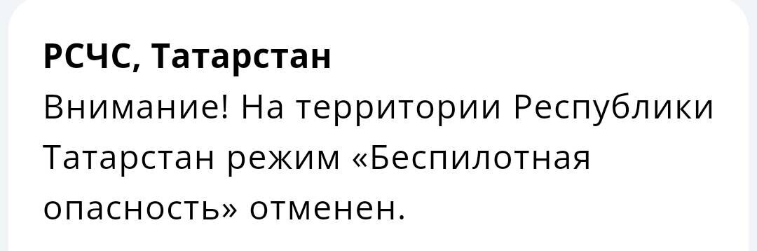 В Татарстане отменили действовавший с 1:41 режим беспилотной опасности, сообщает официальное приложение МЧС.