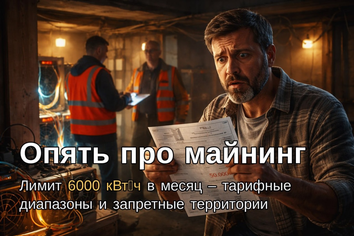 Сергей принес квитанцию и спросил, почему “обычная квартира” вдруг стала потреблять как мастерская. Никакой магии там не было: счетчик спокойно показал цифры, после которых меняются правила и тон разговоров. Во-первых, лимит для домашнего майнинга закреплен Постановлением Правительства РФ № 1469 от 01.11.2024. В нем установлен ориентир 6000 кВт⋅ч в месяц для физлица без статуса ИП, если майнинг ведется без включения в реестр, а превышение лимита требует перехода в режим ИП и реестра. Во-вторых, тем же актом 6000 кВт⋅ч встроены в тарифные диапазоны потребления населения. Регион не вправе установить второй диапазон выше 6000 кВт⋅ч в месяц, а первый диапазон ограничен коэффициентом 0,65 от второго, поэтому эта цифра всплывает даже у тех, кто не майнит, но отапливает дом электричеством и греет воду бойлером. В-третьих, существуют запретные территории, где майнинг запрещен независимо от лимита. Постановление Правительства РФ № 1869 от 23.12.2024 установило запреты на майнинг в ряде субъе