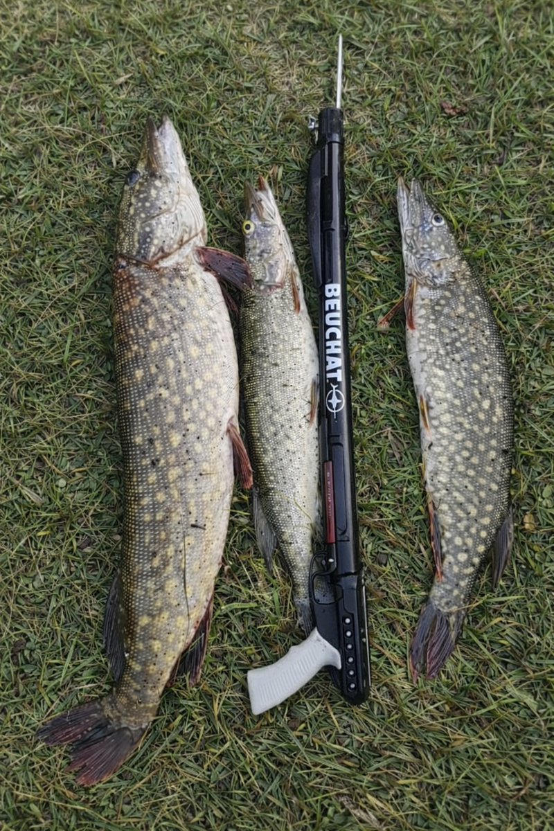 Всплываю, набираю воздух и снова ныряю.Подплываю к тому месту, заглядываю под завал— а она лежит, развернувшись мордой ко мне.Беру её за морду, нащупываю гарпун и пытаюсь вытащить. Щука выходит, но шнур от гарпуна перехлестнулся на ветках. Всплываю, тяну щуку— шнур поддаётся, благо на катушке его достаточно.