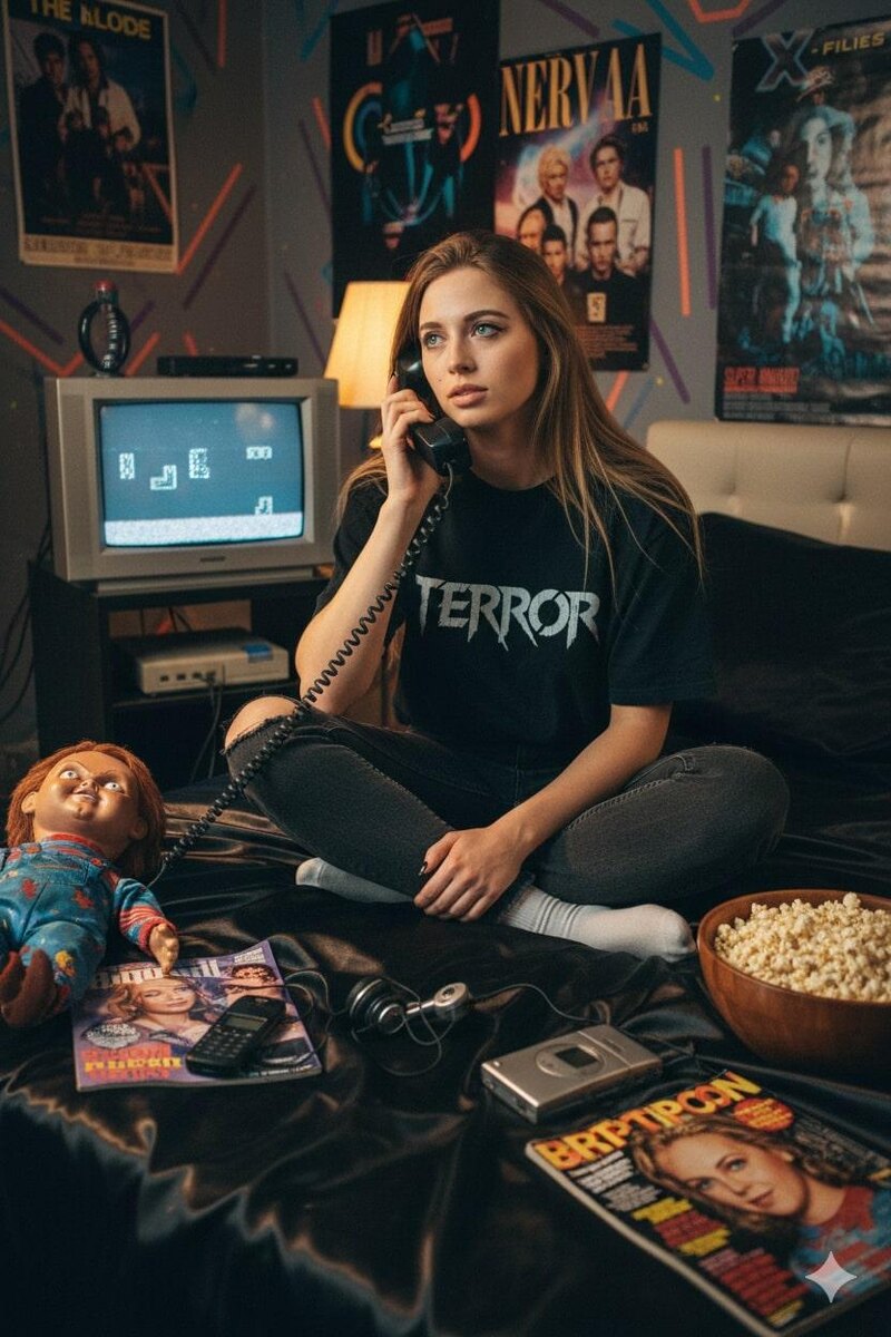 Модель: Nano Banana Сгенерировать🪄 Основываясь на моем селфи, сохраните мое лицо и все физические черты без изменений. Создайте мечтательный портрет в стиле Y2K, где я сижу на блестящей черной атласной простыне, держа в руках большой проводной телефон 90-х годов в задумчивой позе. На мне футболка со словом «террор», черные джинсы и белые носки. Фон — детально проработанная мужская спальня 90-х: старый ЭЛТ-телевизор с ретро-игровой приставкой и постеры в стиле 90-х на стенах. Рядом со мной — журналы о поп-культуре 90-х, черный телефон-раскладушка Motorola V3 и Discman с наушниками. С одной стороны лежит кукла Чаки, ее тело мягко подсвечено, а с другой — миска попкорна. Атмосфера должна быть ностальгической и кинематографической: зернистый вид фотографий 90-х, приглушенное ночное освещение с теплым светом лампы. Сверхдетализированные, фотореалистичные текстуры, высокое разрешение, мрачная эстетика Y2K.
