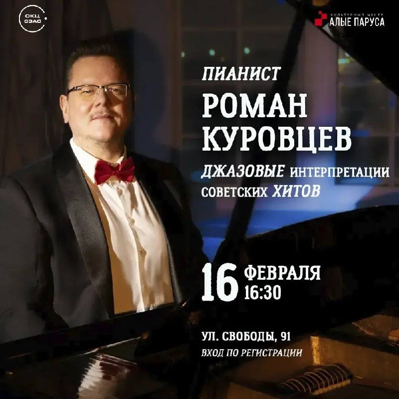 🎼 〰〰〰〰〰〰〰〰〰〰〰 📍Слышишь? Это советские композиции и популярные французские и итальянские мелодии уже стучатся в вашу жизнь 🎼Роман Куровцев — пианист с богатым творческим опытом, выпускник Московской консерватории. Сегодня артист работает в современных жанрах, создавая уникальные музыкальные интерпретации. ⏺Гастролировал во Франции, Японии, Польше и США. ⏺Постоянный резидент ведущих столичных площадок. ⏺Композитор, аранжировщик и вокалист — в этот вечер представит свою сольную программу. 📝16 февраля мы приготовили для вас незабываемый вечер, а именно: ➡️джазовые интерпретации советских хитов ➡️популярные мелодии итальянской и французской эстрады Музыка Романа Куровцева объединяет изысканность, импровизацию и живую энергетику сцены. ✨Проведите вечер, наполнив музыкой каждую клеточку тела 📎Проходите регистрация и насладитесь звучанием старых-добрых хитов: ЗДЕСЬ ✅По всем вопросам: +7 (495) 944-21-01 📅 16 февраля 🕓 16:30 📍 Культурный центр «Алые паруса» ул Свободы д 91 🎟 Вхо