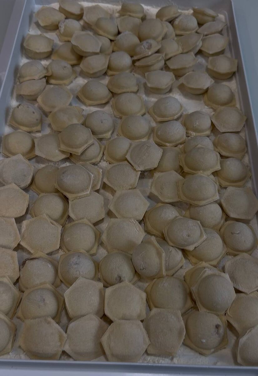 мука- 500гр. + для работы с тестом вода горячая(70-75 градусов) - 250 мл яйцо С1 -1 шт. соль- 1 ч. ложка без горки масло растительное без запаха- 25 мл. мясо (говядина и свинина) - 550гр. лук репчатый - 200г. вода - 70-80 мл. соль - 1 ч.л. без горки перец черный молотый - по вкусу Это пропорции примерно на 1 кг. пельменей. В среднем (смотря какая у Вас форма или же вы лепите руками) получается около 150 пельменей. Фарш я готовлю самостоятельно и он у меня всегда получается очень вкусный (не сухой и не жирный). Если интересны пропорции и из каких частей мяса я его готовлю, напишите, посвящу фаршу статью. Для начала подготавливаем ингредиенты и нужную посуду. Для приготовления из посуды я использую: В муку добавляем соль, яйцо и растительное масло. Сдвигаем яйцо немного к краю миски, чтобы оно не сварилось. Заливаем муку горячей водой (температура 70-75 градусов), постоянно помешивая ложкой. Затем замешиваем тесто руками. Если останутся небольшие вкрапления сварившегося желтка- ничег