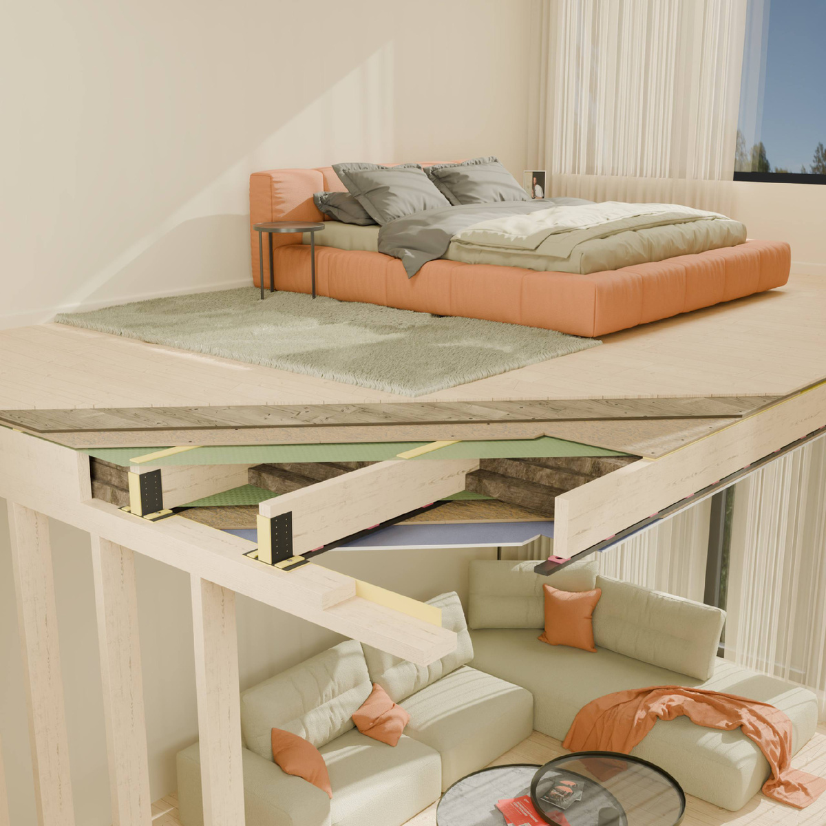 Основная проблема домов с деревянным перекрытием заключается в том, что шум и вибрации беспрепятственно распространяются по всему каркасу. Чтобы заглушить шаги сверху, скрип, удары и воздушные шумы, необходимо на этапе строительства задуматься и сделать полноценную звукоизоляцию. Расскажем пошагово! 1. Прокладка. Не забываем «разрывать» жесткие связи всех ограждающих конструкций при помощи Ультракустик-F100 в местах примыкания и на верхней части кромки балки перекрытия, куда будут монтироваться листы обшивки пола. 2. Заполнение пространства. Внутренний объём перекрытия заполняется звукопоглощающими плитами Шуманет ECO-S (до трех слоев - зависит от желаемого результата). Это поможет рассеять и поглотить звук, который будет проходить через перекрытие. 3. Монтируем пол. На верхнюю часть перекрытия монтируются утяжеленные листы Саундлайн-GS, все стыки и примыкания которого обрабатываются виброакустическим герметиком Ультракустик, чтобы сделать конструкцию герметичной. Поверх листов уклады