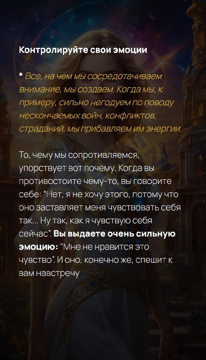 Контролируйте свои эмоции * Все, на чем мы сосредотачиваем внимание, мы создаем. Когда мы, к примеру, сильно негодуем по поводу нескончаемых войн, конфликтов, страданий, мы прибавляем им энергии. То, чему мы сопротивляемся, упорствует вот почему. Когда вы противостоите чему-то, вы говорите себе: “Нет, я не хочу этого, потому что оно заставляет меня чувствовать себя так... Ну так, как я чувствую себя сейчас”. Вы выдаете очень сильную эмоцию: “Мне не нравится это чувство”. И оно, конечно же, спешит к вам навстречу Архитектура вашей души | Ваш Ангел и Демон T | VK | Pin | YouTub | Dzen #живисейчас #любовьктелу #любовьктелу #мотивациякаждыйдень #духовныйрост #путьксебе #исцеление #психологияжизни #возможности #13число #13февраля