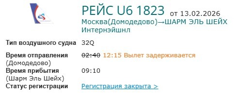 ». U6 1804 должен был прибыть в Домодедово из Хургады в 01:10, а прилетел только в 11:12. На 10 часов позже отправится U6 1823 из Домодедово в Шарм-эль-Шейх: в 12:45 вместо 02:40. Проблемы и во Владикавказе, где на 8 часов опаздывает самолет из Египта и соответственно на такое же время откладывается вылет из этого города (рейсы U6 1830 и U6 1829). Как рассказали редакции в «Уральских авиалиниях», причиной стал длительный «ковер» в Казани – самолет, выполняющий рейсы в Египет, простоял там 11,5 часа. В итоге график сбился. Подробнее написали на ТурДоме. @tourdom