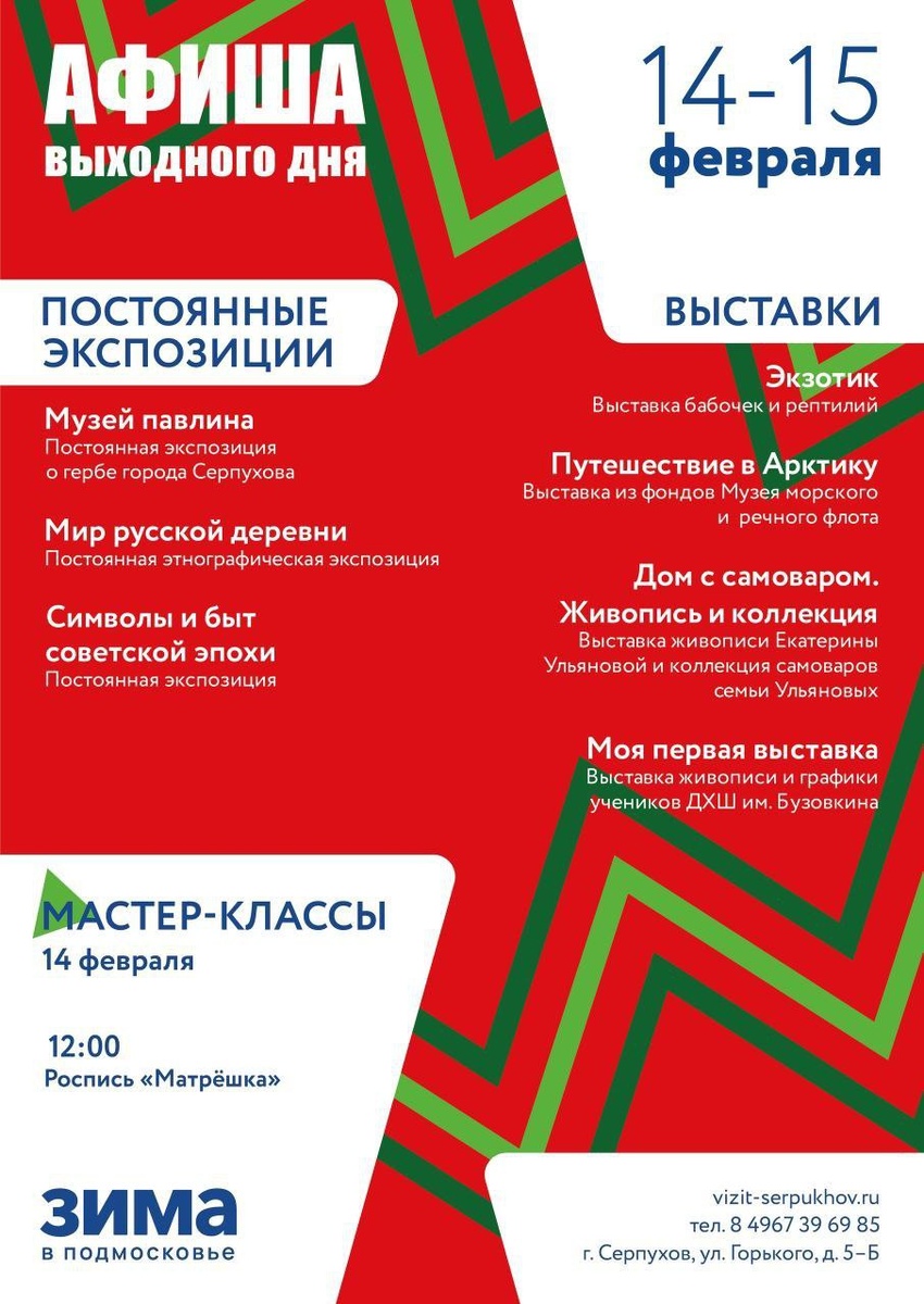 Что можно посмотреть? 🦚 Постоянная экспозиция «Музей павлина» vizit-serpukhov.ru/exposition... ️ 🔸️ Постоянная экспозиция «Мир русской деревни» vizit-serpukhov.ru/exposition... 📻 Постоянная экспозиция "Символы и быт советской эпохи" vizit-serpukhov.ru/exposition... 🚢 "Путешествие в Арктику". Выставка из Музея морского и речного флота (г.Москва) vizit-serpukhov.ru/exposition... 🎄 "Дом с самоваром. Живопись и коллекция". Выставка живописи Екатерины Ульяновой и самовары из коллекции семьи Ульяновых. vizit-serpukhov.ru/exposition... 🖼 "Моя первая выставка". Выставка живописи и графики учащихся ДХШ им. А.А .Бузовкина. 🦋 Выставка живых бабочек и рептилий vizit-serpukhov.ru/exposition... 📅 14 февраля: ️ ⏰️ 12.00 - мастер-класс "Матрешка" (роспись) 📆 14.02.2026 , 15.02.2026 🏢 Музейно-выставочный центр 📍 г. Серпухов, ул. Горького, 5б ⭐Поддержать канал голосом 💰 Канал Вакансии Серпухова ✅ Мероприятия Серпухов https://dzen.ru/id/66f01c6eb4c6fe60c9ca1608 http://vk.com/serpukhov_