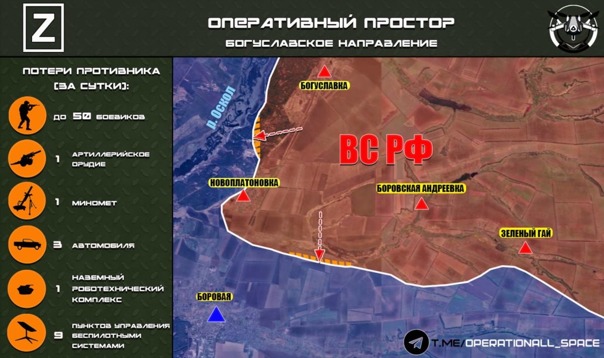 🔻Штурмовые подразделения #1_танковой_армии ГВ «Запад» зачищают лесной массив вдоль реки Оскол, а также ведут бои за укреплённые опорные пункты противника в направлении н.п. Боровая. Оперативный простор Карта носит ориентировочный характер и может быть скорректирована по мере поступления новых данных.
