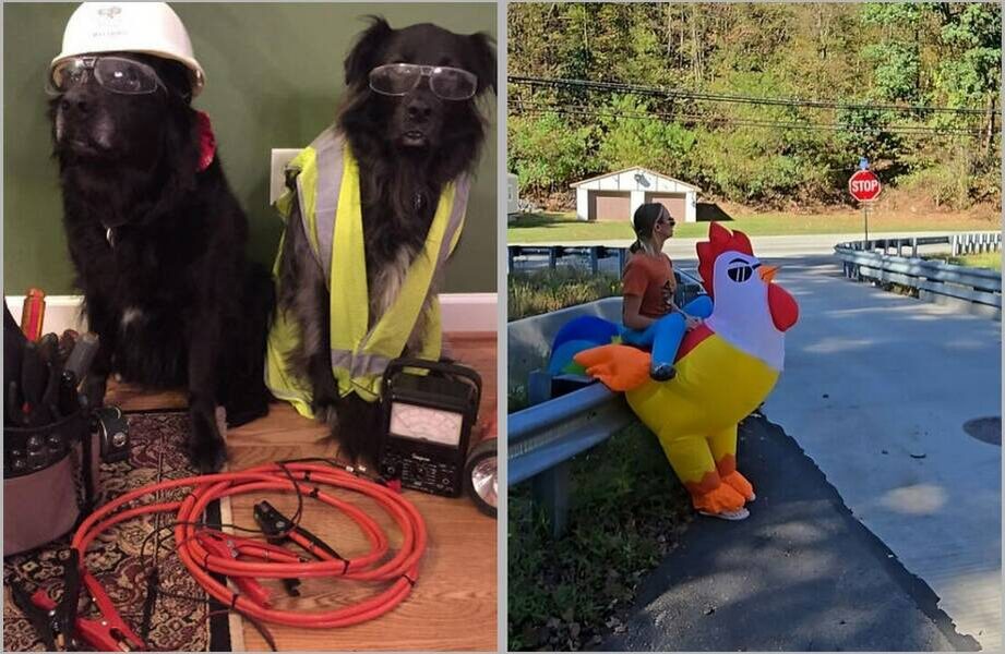 Когда отключили свет на долгое время, отец решил нарядить собак в электриков