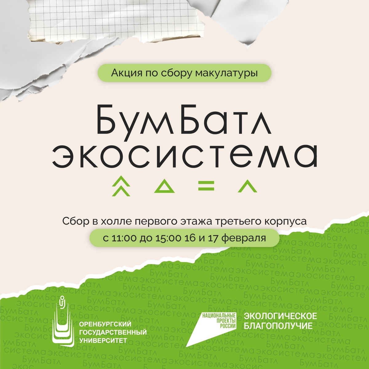 ? 📁 16 и 17 февраля ОГУ станет площадкой Всероссийской акции по сбору макулатуры «Бумбатл» в рамках национального проекта «Экологическое благополучие». Сдать старые записи, бумагу или картон можно будет с 11:00 до 15:00 в холле первого этажа третьего корпуса у волонтёров проекта. Также на площадке организован сбор пластиковых крышек и батареек. Начинай новый учебный год экологично – твоя помощь планете вернётся уже скоро! 🌐 🇷🇺 Мы в MAX #ОГУ #в_ОГУ #OSU