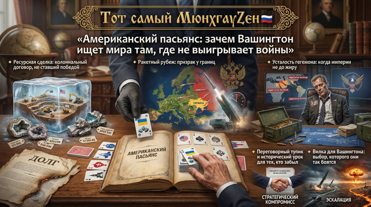 🚨 Американский пасьянс: зачем Вашингтон ищет мира там, где не выигрывает войны - Часть 2️⃣/3 И здесь мы видим глубочайшее противоречие в действиях Белого дома. С одной стороны, Трамп — единственный западный лидер, публично признавший законный интерес России в нерасширении НАТО. С другой — его администрация продолжает видеть в Украине не мост к миру, а таран против нашего суверенитета. Вашингтон пытается вести двойную игру: устами госсекретаря рассуждать о контроле над вооружениями, а делами готовить развертывание запрещенных когда-то систем у самых наших ворот. Именно поэтому для Москвы неприемлема любая «заморозка», сохраняющая киевский режим и его покровителей у наших границ. Это не мир, а передышка перед неизбежным, более масштабным столкновением. 🔹 Усталость гегемона: когда империи не до жиру Третья причина — самая унизительная для Вашингтона, хоть они и не признают этого вслух. Америка больше не в состоянии держать в руках все клинки, которые сама же и разбросала по миру. Про