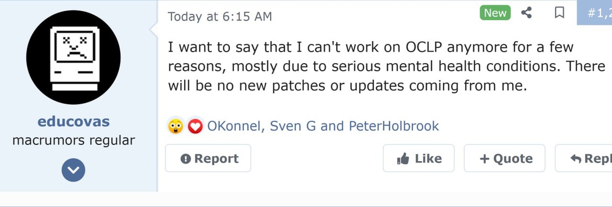 ! Тот самый разработчик, который записал себе участие чуть ли не во всех компонентах OCLP, заявил - что он не может и не будет работать над проектом, из за проблем с головой, да. Учитывая, что ни одного коммита на гитхабе ни в основном, ни посвящённом Tahoe разделах - от него не наблюдается, то вырисовывается интересная картина... ...ну примерно то, о чём я последние полгода и говорю.