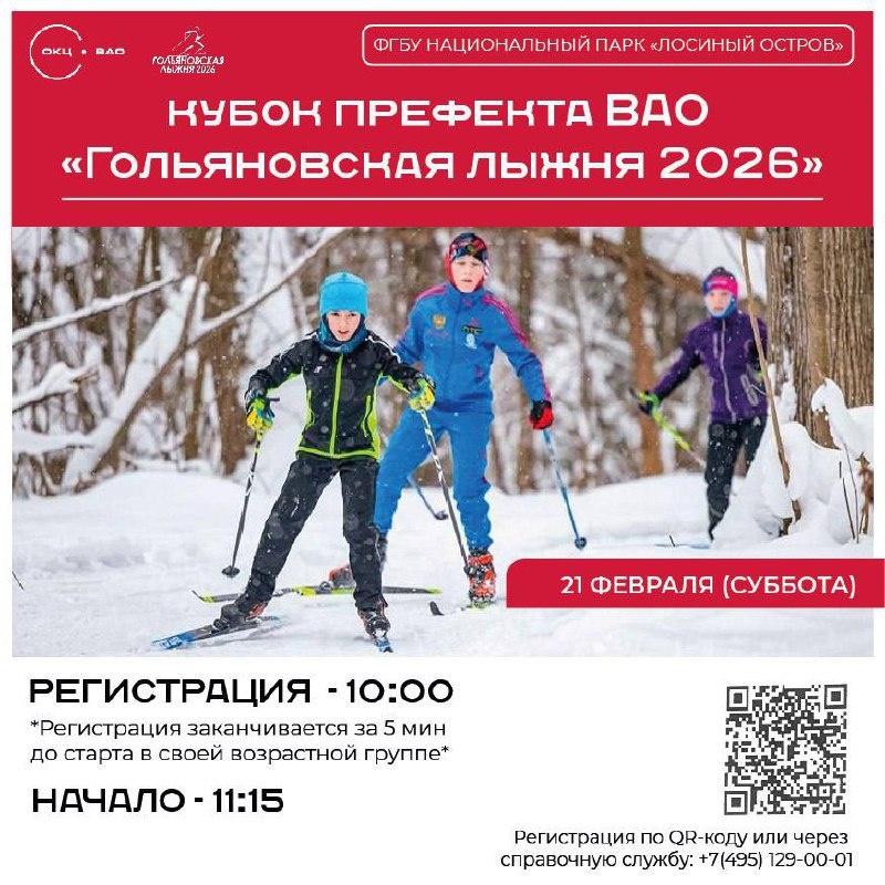 " Пришло время проверить свою скорость и волю к победе! ❄️🏆 Мы объявляем о старте ежегодного лыжного соревнования "Гольяновская лыжня" — это ваш шанс бросить вызов себе, соперникам и зимней трассе! 📍 Адрес проведения: ФГБУ "Национальный парк "Лосиный остров" (Вход со стороны Уральской ул., д.23, к2) СХЕМА 📒 Дата: 21 февраля. 🤩 Регистрация участников: 10:00-11:00 🤩Начало соревнований: 11:15. *Регистрация заканчивается за 5 минут до старта в своей возрастной группе.* 📍 Всё, что нужно знать участнику: Положение о мероприятии: ПОЛОЖЕНИЕ Зарегистрироваться можно онлайн: РЕГИСТРАЦИЯ Или по телефону справочной службы: +7 (495) 129-00-01 Не упусти возможность зарядиться азартом, драйвом и зимним адреналином! Ждём всех, кто готов к спортивным победам и отличному настроению!⛷
