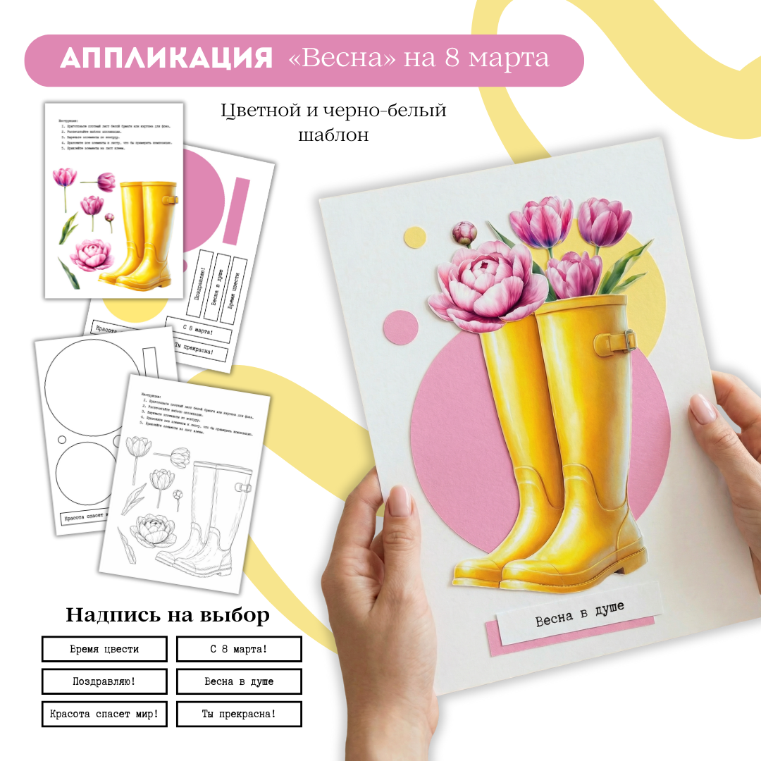 Скачать шаблон для печати весенней аппликации можно в моем сообществе ВК «Путеводная Педагогика» по подписке вк донат. Иллюстрации с нежной акварелью (тюльпаны и пионы в ярких жёлтых сапожках, дополненные современными геометрическими формами) создают атмосферу весны, свежести, радости и праздника. В комплект входят цветной и чёрно-белый шаблон. Цветной вариант подойдёт А чёрно-белый для раскрашивания и развития творческого самовыражения детей. Все элементы аппликации удобно размещены на листах для печати, отдельные детали для вырезания и 6 вариантов поздравительных и вдохновляющих надписей («Весна в душе», «С 8 марта!», «Ты прекрасна!» и др.), что позволяет адаптировать работу под задачу занятия,