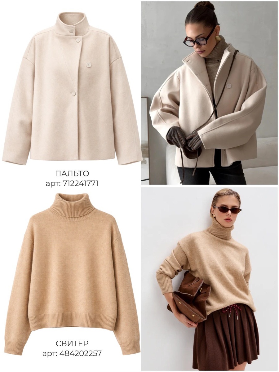 На фото как раз такой набор: мягкие оттенки сливочного, карамели, фисташки и шоколада, плюс удобная «городская» спортивная пара. Ниже — разбор каждой находки строго по порядку и с артикулами, с подробностями по посадке, фактуре, стилизации и маленькими приёмами, которые сразу собирают образ.