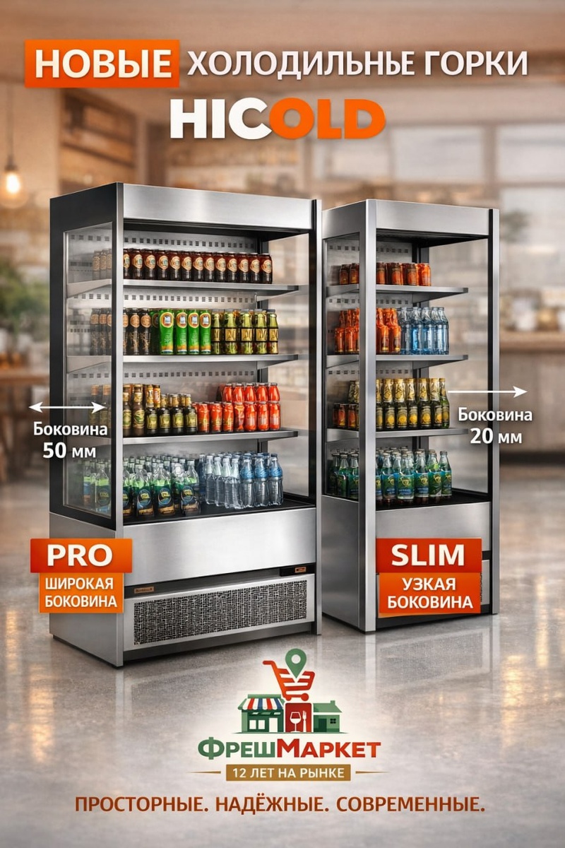 Разбирал их новые серии и вот что реально понравилось 👇 🟧 Горки позволяют разместить заметно больше товара на той же площади — удобно, когда пространство ограничено, а выкладку хочется сделать шире. 🟧 Корпус полностью из нержавеющей стали — это не только про внешний вид, но и про нормальную эксплуатацию без постоянных переживаний за износ. 🟧 Полки регулируются по наклону, а стеклянные боковины дают хорошую обзорность товара — визуально смотрится аккуратно и современно. Есть две версии: ▪️ PRO — с более широкой боковиной (50 мм) ▪️ SLIM — максимально компактная (20 мм), но внутренний объём остаётся тем же. По размерам можно подобрать под разные задачи: — ширина: от 540 до 1500 мм — глубина: 600 или 700 мм — высота: 1800 мм (3 полки) или 2000 мм (4 полки) Рабочий диапазон температур: +2…+7 °C Динамическое охлаждение — холод распределяется равномерно, без “переморозки”. Подходят для помещений с температурой от +12 до +25 °C — классическая история для торговых залов и кофеен.