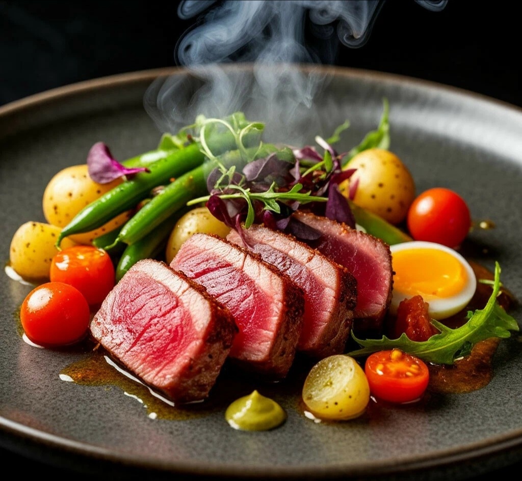 Мяу, мои ценители прекрасного! 😼🎨 Сегодня на тарелке — Ницца в квадрате. Нисуаз, но не простой, а с прожаркой «блэк энд блю», анчоусной эмульсией и перепелиным яйцом с жидким желтком. Это салат, где каждый ингредиент — солист, а вместе они — опера.