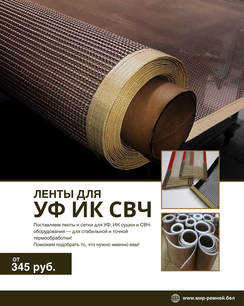 В промышленной сушке (УФ-отверждение чернил, ИК-сушка покрытий, СВЧ-обработка электроники или текстиля) ключевые проблемы повторяются: Решение, которое используют в полиграфии, текстиле, электронике и ЛКМ-производствах: PTFE (тефлоновые) ленты и сетки — специально адаптированные под УФ, ИК и микроволновые туннели. В «Мир ремней» мы производим их сами в Минске: сплошные полотна или открытые сетки с ячейкой 2×2,5 мм, 4×4 мм и другими, любые размеры, края (кевлар, стекло, красный бордюр), бесконечные или с замками. Сроки 1–3 дня, от одной штуки до партий. Почему PTFE — золотой стандарт для таких сушек 🔹 Термостойкость до +260 °C (кратковременно выше) — не деформируется, не плавится при длительном ИК/СВЧ-нагреве.