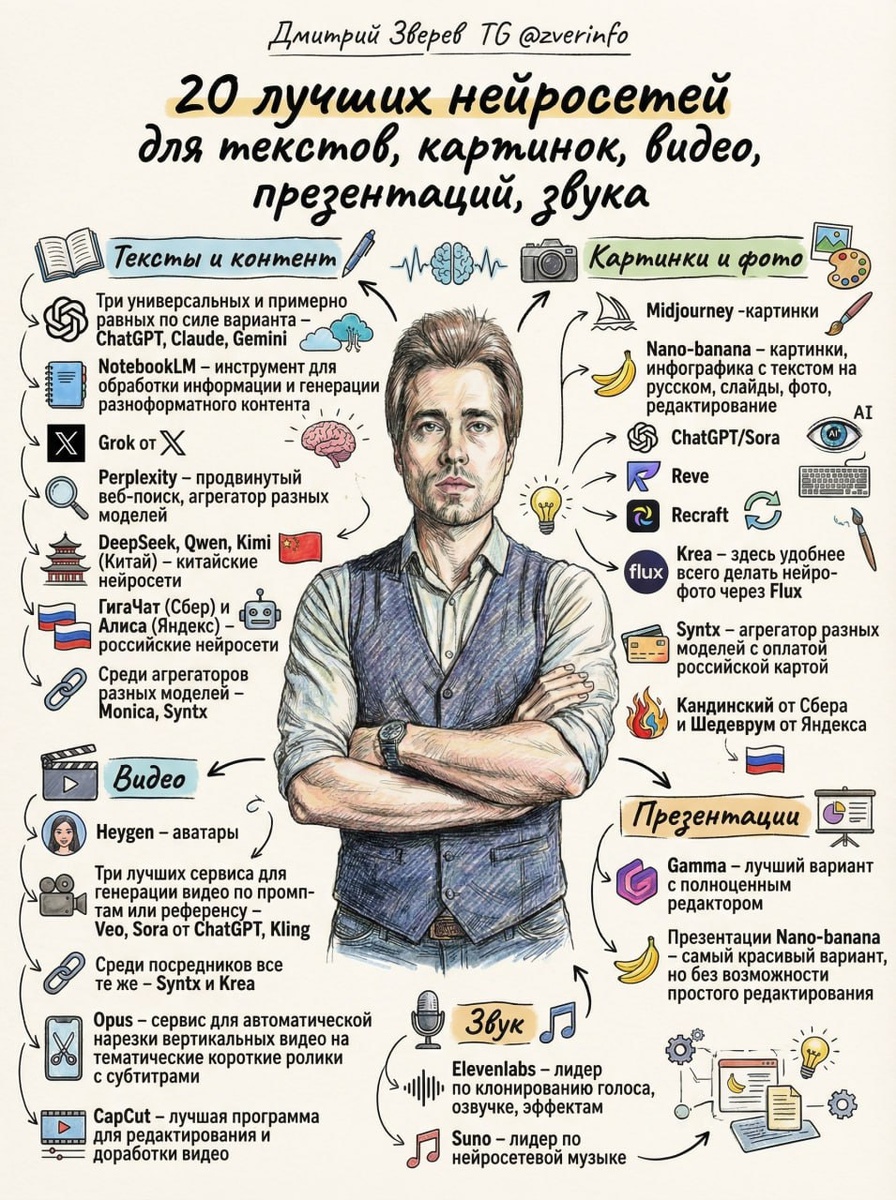 20 лучших нейросетей для текстов, картинок, видео, презентаций [инфографика]