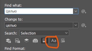 Если вам нужно поменять в тексте слова с учётом регистра (например, важно исправить название компании, написанное в разных вариантах по всему журналу), то вы при автозамене в индизайне можете включить галочку «учитывать регистр» (см. скрин), и программа будет искать только такое написание, как в верхнем окне, а менять его на строго указанное в нижнем.