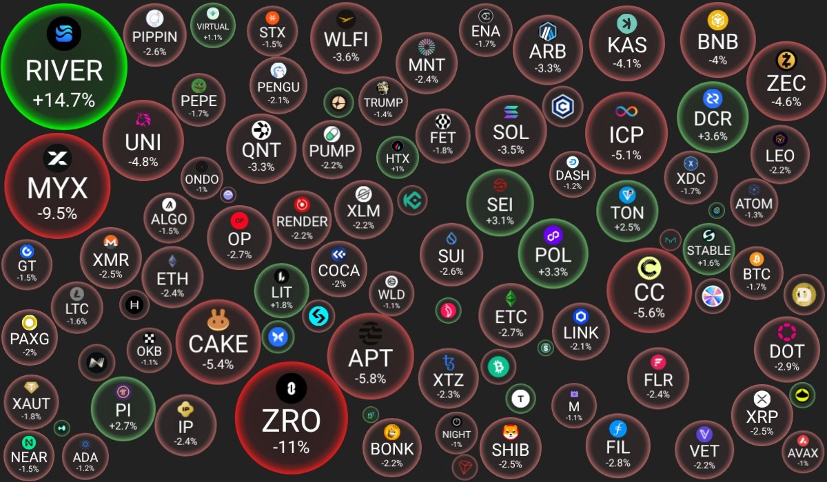 🗓 13.02.2026 09:30 по Москве. 🔗 Посмотреть на сайте 📈 Лидеры роста (из ТОП-100): 🟢 River (RIVER): $19.87 (+16.3%) 🟢 Decred (DCR): $22.39 (+3.6%) 🟢 POL (prev. MATIC) (POL): $0.0946 (+3.3%) 📉 Лидеры падения (из ТОП-100): 🔴 LayerZero (ZRO): $1.8625 (-10.4%) 🔴 MYX Finance (MYX): $3.0539 (-8.8%) 🔴 Canton Network (CC): $0.1591 (-5.7%) 🔍 Основные метрики: 🔴 Общая капитализация: $2263.17 млрд (-1.75%) 🔴 Общий объем торгов: $102.23 млрд (-8.72%) 🔴 Доминация Bitcoin: 58.32% (-0.03%) 🔴 Доминация Ethereum: 10.28% (-0.08%) 🟢 Индекс страха и жадности: 9 / 100: ЭКСТРЕМАЛЬНЫЙ СТРАХ (+4) 🔴 Индекс Альтсезона: 28 / 100: НЕ АЛЬТКОИН-СЕЗОН (-3) 📖 Интересно почитать: 👉 Что такое бессрочные фьючерсы в криптовалюте: подробное руководство для трейдеров. 😻 Наши сервисы и бонусы: 👥 VK - наша группа в VK 👛 Antarctic Wallet - Оплата криптой в магазинах по QR-коду. Безопасный вывод USDT на карту.