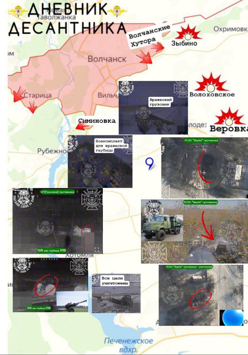 Докладывает Добрый 🫡 На Харьковском направлении в окрестностях Волчанска сохраняется высокая интенсивность боев в районах населенных пунктов Старица и Волчанские Хутора. ВС РФ планомерно продвигаются вглубь области, продавливая оборону врага. Позиции ВСУ в тыловых районах уничтожаются российской авиацией и артиллерией. Враг активно применяет ударные БПЛА типа "Баба Яга". 🪖 В районе населенного пункта Старица идёт зачистка окрестных лесных массивов, а возле населенного пункта Симиновки наши штурмовики продвинулись сломив сопротивление врага и расширив зону контроля территории в окрестностях села. Боевые действия в районе населенного пункта Волчанские Хутора поддерживает наша авиация, нанося удары по позициям ВСУ. В ходе разведывательных мероприятий была обнаружена и уничтожена вражеская РСЗО "Верба" в районе населенного пункта Веровка. В районе населенного пункта Волоховское ВС РФ обнаружили и уничтожили ударами FPV-дронов грузовик и артустановку ВСУ. Российские дроны уничтожили