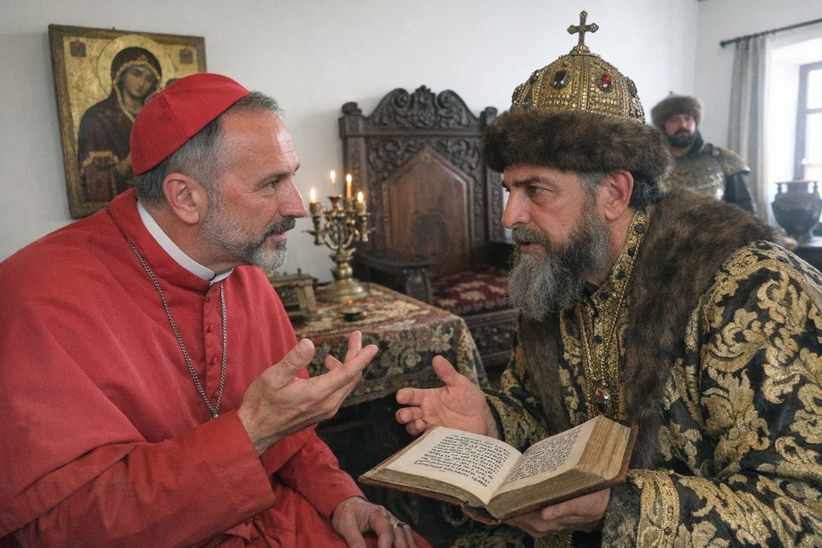 Привет, дорогие товарищи. Во время Ливонской войны Иван IV, обеспокоенный успехами Стефана Батория, делает попытку к мирным переговорам, для чего 25 августа 1580 года решает обратиться к папе Римскому Григорию XIII за посредничеством. Римская курия🐔 использовала ситуацию в качестве предлога для нового визита папского представителя в Москву. Для этой миссии был выбран Поссевино, получивший полномочия апостольского нунция Антонио Поссевино, был первым иезуитом, посетившим Московию. И скорее всего, он не принадлежал к числу городских сумасшедших, а даже наоборот славился эрудицией начитанностью и максимальной образованностью. В Его труде «Московия. Беседы о Религии» (серьезный исторический источник) Когда Грозный сказал, что Московия приняла Христанство с самого начала, когда Андрей Первозванный пришел с Проповедью, а при Владимире вера окрепла. Далее по тексту: Антонио понимал, что государь говорит это потому, что сам Антонио не один раз при всяком удобном случае объяснял боярам и д