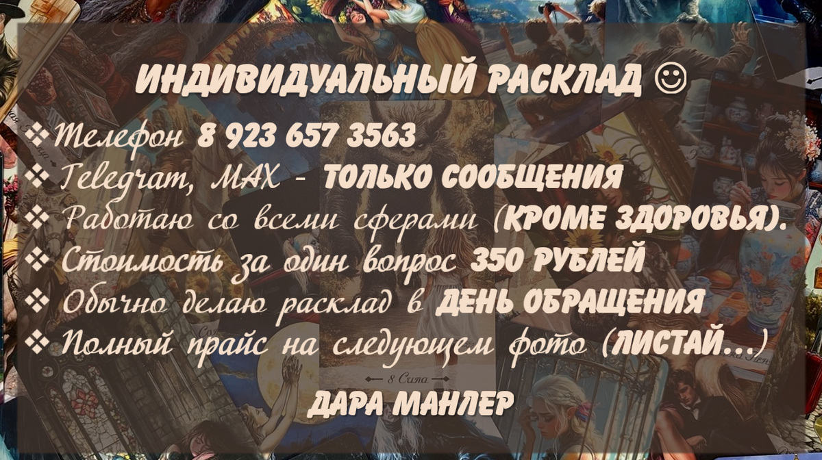 Привет, красавица! Сегодня у нас пятница – а это значит не грузим себя трудностями и настраиваемся на позитивный лад. Чтобы выходные дни, и пять дней, после них были солнечными, успешными и конечно, романтичными. Романтика – приходит в жизнь тогда, когда мы ее замечаем, создаем или притягиваем. Без романтики – краски жизни меркнут! 🤗Ну, а вопрос у нас «Чем отношения с ним порадуют меня в ближайшие дни?» 🧙♀️Помни, я всегда могу дать ответ на этот вопрос лично тебе – пиши и мы всё подробно разберём 💝 🔮Нужен просмотр - заглядывай на ЛИЧНУЮ КОНСУЛЬТАЦИЮ 💟Получи свой расклад на любимого и талисман - участвуй в акции ЛЮБОВНОЕ НАСТРОЕНИЕ События ближайших дней дадут тебе ясно понять, что отношения с любимым переходят в новое качества. В них медленно и прекрасно зацветет новый период гармонии и счастья. Ты вдруг по – новому взглянешь на своего мужчину – увидишь его заботу, ласку и любовь. И он тоже, взглянет на тебя другими глазами - и ты поймешь, что всё еще "лучшая" для него. Про сюр