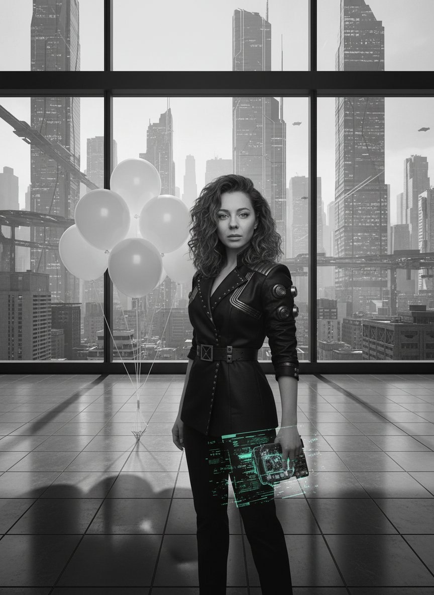 🎨 Промпт: The woman from the reference photo, her facial features and likeness unchanged, stands defiantly in a vast cyberpunk penthouse with floor-to-ceiling windows overlooking a monochrome metropolis. She wears a sharply tailored, military-inspired black jacket with metallic details. Moody, low-key lighting from hidden sources contrasts with the soft, diffused mid-morning light glowing through the windows. In the deep focus shot, a cluster of stark white, floating balloons tethered by thin cables drifts near her, their shadows elongated on the polished floor. She grips a holographic data-interface that glitches with neon-green static, her expression edgy and rebellious, a direct challenge to the ordered world outside. The scene is rendered in a dramatic monochromatic black and white color palette. Банк Промптов | Твои Идеи