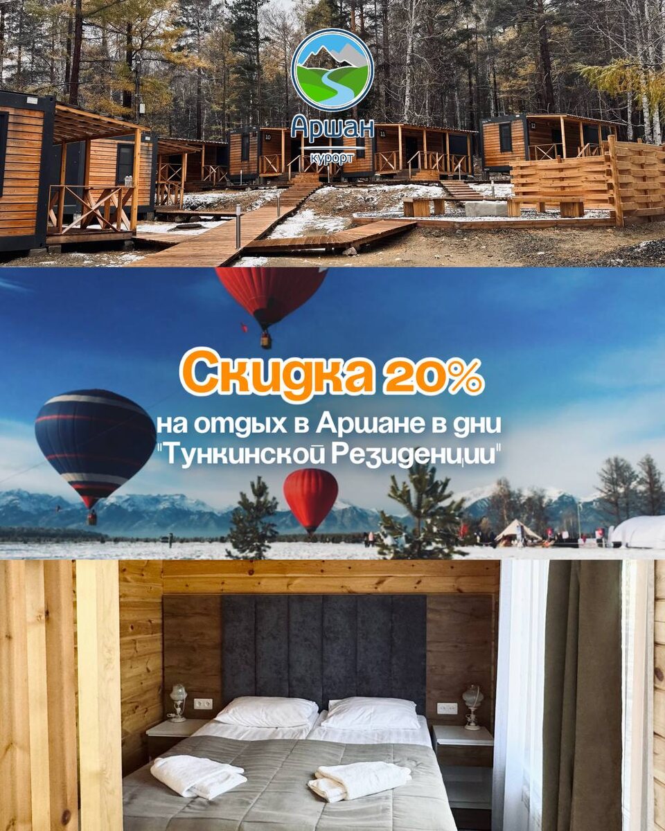 » В дни фестиваля мы готовы принять вас в комфортабельных номерах санатория «Саяны» и уютных глэмпингах со скидкой 20%. Идеальное место, чтобы насладиться природой Бурятии, восстановить силы и открыть для себя легендарный курорт. Забронируйте номер со скидкой: • на сайте kurort-arshan.ru • по телефону 8 (800) 100-48-58 • у менеджера отдела продаж @Resorts_of_Buryatia_Sale Ждём вас в Аршане💙