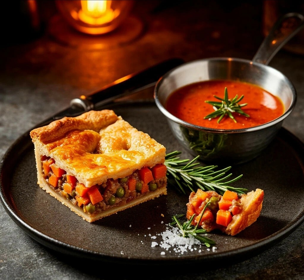 ПОЧЕМУ ЭТО ШЕДЕВР? 🎨 ЭтоShepherd's Pie в смокинге. Красное вино в начинке — не фон, а полноценный участник: оно карамелизуется, создавая сладко-кислый фон, имитирующий демиглас. А сливочная заливка с грюйером превращает грубоватую деревенскую запеканку в элегантный французский киш. Брутально и изысканно одновременно. 🎩