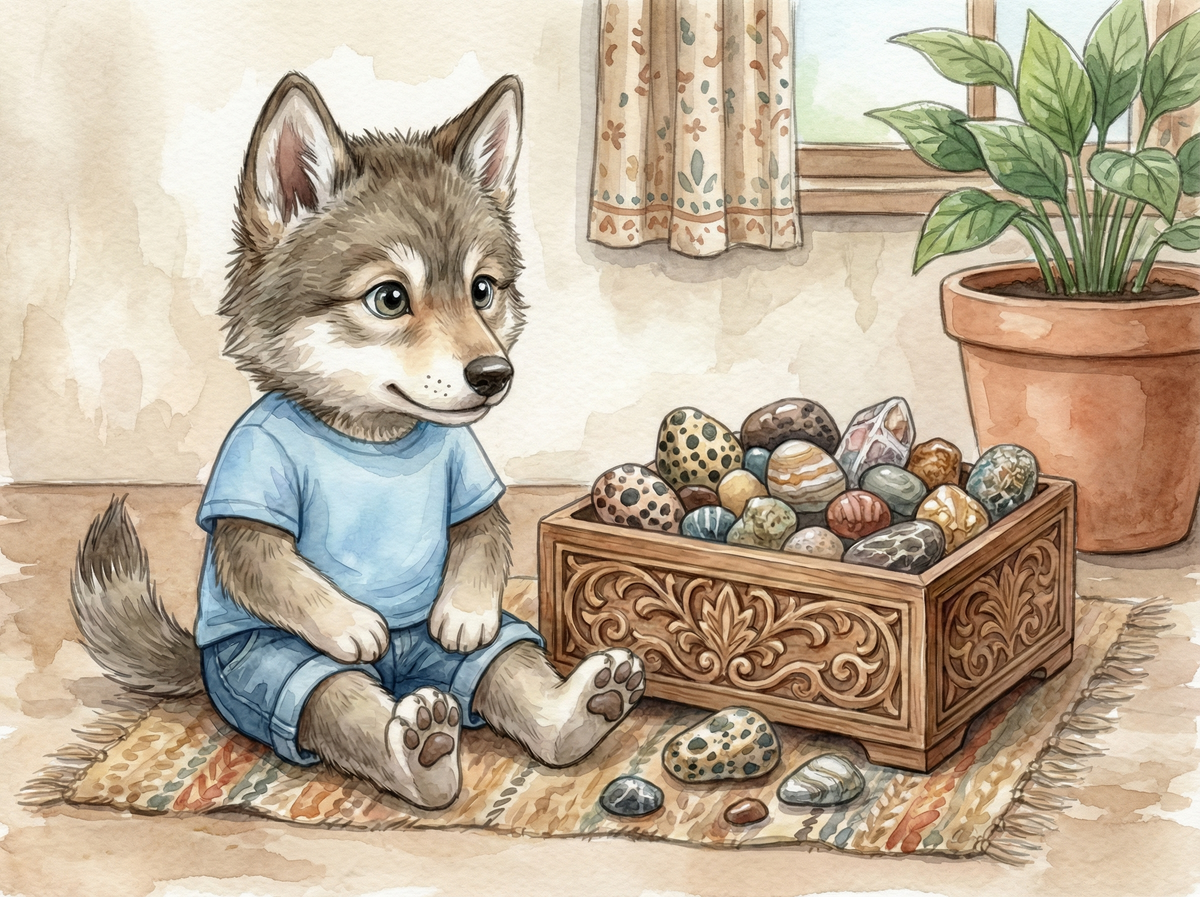 В самом сердце Лесного городка, где тропинки усыпаны хвоей, а воздух пахнет ягодами и мхом, жил Волчонок по имени Грей. Он любил гоняться за солнечными зайчиками и яркими бабочками, играть в догонялки с друзьями, а ещё — собирать красоту. Целые дни он мог проводить в поисках необычных, блестящих камушков. У него была целая коробка сокровищ: с белыми полосками, с серебристыми блёстками, с дырочкой посередине.