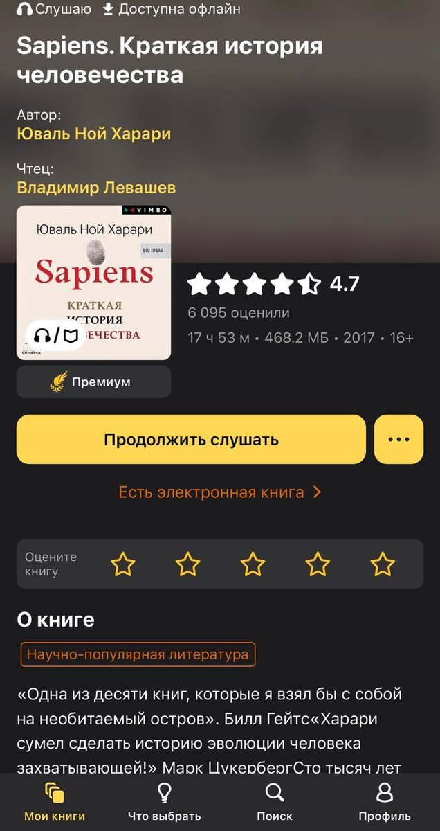 Чем больше знаешь, тем шире смотришь😁 Сто тысяч лет назад Homo sapiens был одним из многих видов человека - ничем не примечательным животным, которое играло в экосистеме роль, не большую, чем гориллы, слона или льва. Около семидесяти тысяч лет назад, загадочное изменение когнитивных способностей Homo sapiens превратило его в хозяина планеты и кошмар экосистемы. Как мы смогли покорить мир? Что стало с другими видами человека? Когда и почему появились деньги, государства и религия? Как возникали и рушились империи? Почему весь мир говорит на английском? Почему именно страны Европы колонизировали пол мира, а не наоборот? Откуда взялась идея веры в Бога? Почему почти все общества ставили женщин ниже мужчин? Как наука и капитализм стали править нашими головами? Когда лучше жилось? Тогда или сейчас? Столько интересных вопросов и ответов😄 Увидишь связь между событиями прошлого и тем что есть сейчас. Посмотришь на многие вещи об окружающем мире под новым углом. Оценка 10/10. Слушал ту