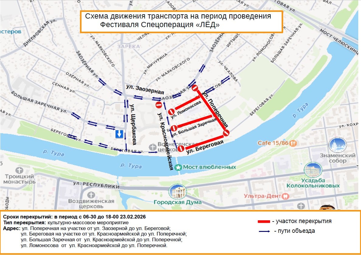 » В связи с проведением мероприятия «Спецоперация Лёд» 23 февраля с 6-30 до 18-00 планируется прекращение движения транспортных средств по: - ул. Поперечной, на участке от ул. Заозерной до ул. Береговой; - ул. Береговой, на участке от ул. Красноармейской до ул. Поперечной; - ул. Большой Заречной, от ул. Красноармейской до ул. Поперечной; - ул. Ломоносова, от ул. Красноармейской до ул. Поперечной. На время проведения мероприятия будет организовано одностороннее движение по следующим участкам автомобильных дорог: - ул. Щербакова, на участке от ул. Большой Заречной до ул. Береговой; - ул. Береговая, на участке от ул. Щербакова до ул. Красноармейской; - ул. Красноармейская, от ул. Береговой до ул. Заозерной. Участников дорожного движения просим обращать внимание на знаки, заранее планировать маршрут, соблюдать Правила дорожного движения РФ. Возможные маршруты объезда: ул. Заозерная, ул. Щербакова.