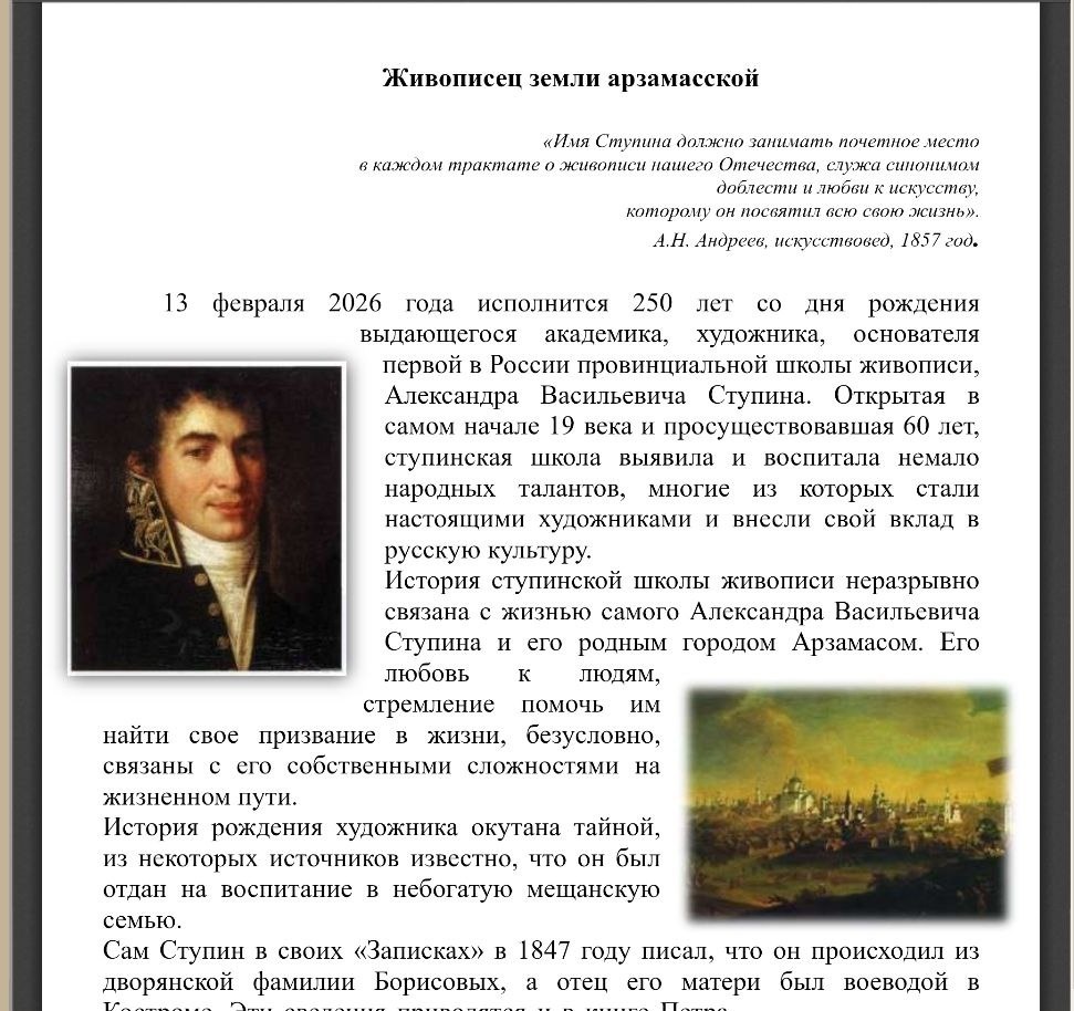 🎨 13 февраля 2026 года исполняется 250 лет со дня рождения Александра Васильевича Ступина – академика, основателя первой в России провинциальной школы живописи. Она просуществовала почти 60 лет, и еще при жизни своего основателя стала одним из заметных явлений культурной жизни России первой половины XIX века. Приглашаем вас познакомиться с обзором жизни и творческого становления Александра Васильевича Ступина, а также его знаменитой школы в рубрике «Приглашение к чтению».