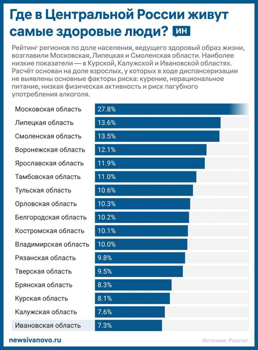 Владимирская область стала 11-ым регионом ЦФО по здоровью граждан. Об этом следует из исследования, проведённого «Ивановскими новостями». Лишь у 10% взрослых владимирцев, прошедших диспансеризацию, не выявлены факторы риска в виде нерационального питания, курения, употребления алкоголя и малой физической активности. Рядом с нашим регионом расположились соседние Рязанская (9,8%) и Костромская (10,1%) области. Люди с наибольшим количеством факторов риска живут в Курской, Калужской и Ивановской областях, а ЗОЖников больше всего в Московской, Липецкой и Смоленской.