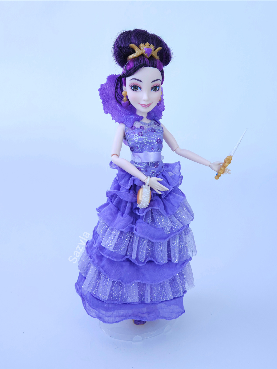 При кажущейся простоте аксессуаров у куклы достаточно много, и большая часть из них “ в золоте”. Тут и диадема, и серьги и микросумочка. Воротник сливается с платьем и из образа не выпадает, пусть он и пластиковый.