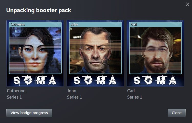 Мне Steam время от времени присылает бесплатные бустер паки, вот вчера вечером прислали по SOMA, и сразу захотелось опять пройти :) Если у кого-то есть ненужные карточки, можно обмениваться, вот мой Steam код для френдирования 7833735. Думаю, что начну сюда закидывать объявы по обмену карточками, будет больше пользы от канала!