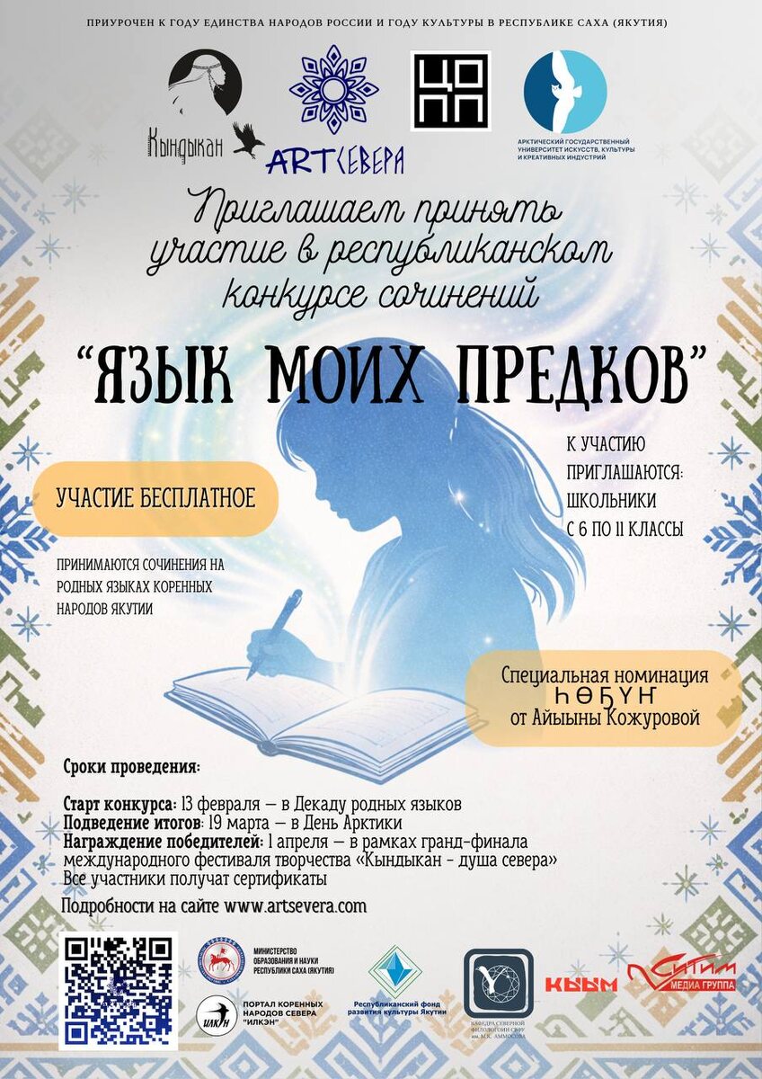 »! ✨ Совместно с юным блогером Айыыной Кожуровой и Центром опережающей профессиональной подготовки Якутии 📚 Для всех школьников 5–11 классов 💛 Специальная номинация на якутском языке от Айыыны — по мотивам её проекта «ҺӨҔҮҤ» 📅 Старт: 13 февраля 🏆 Финал и награждение: 1 апреля на фестивале «Кындыкан — душа Севера» 🎖️ Каждый участник получит сертификат 🌐 Лучшие работы будут опубликованы онлайн 💬 Пока жив язык — жив народ. ✍️ Пиши, делись своей историей и памятью о предках! 👉 Подробности и положение конкурса: artsevera.com #АГУИККИ #ЯзыкМоихПредков #ЯкутскийЯзык #ҺӨҔҮҤ #Кындыкан #ДушаСевера #АйыынаКожурова #ЦОПП Читайте и смотрите нас на сайте / 💬Telegram / 💙 ВКонтакте / 📺 Rutube / 📲 MAX
