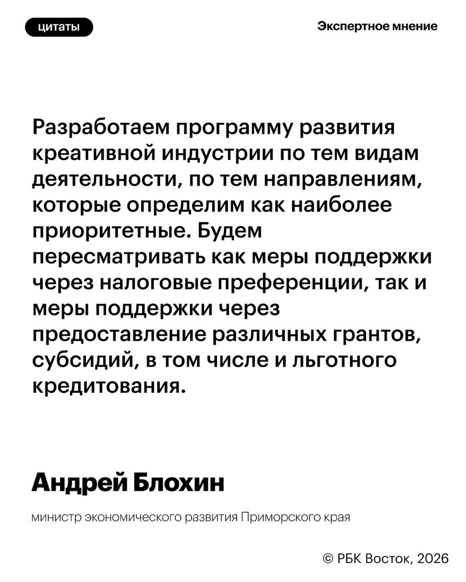 Это 1,4% от всего ВРП По словам министра экономического развития региона Андрея Блохина, в крае есть возможности для роста вклада творческого бизнеса. Чтобы компании развивались, власти разработают комплекс мер поддержки, от налоговых преференций до предоставления различных грантов, субсидий, в том числе и льготного кредитования. Подробнее – в мнении министра на сайте. 🔗 РБК Восток в Telegram и MAX