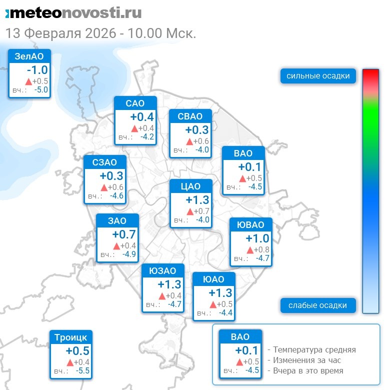 В 10:00 в Москве было от -1.3°C до +1.8°C, средняя температура +0.6°C #погода #Москва #зима #температура #13февраля #пятница