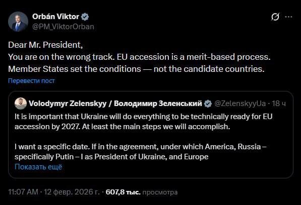 "Уважаемый президент, вы на неверном пути. Вступление в Евросоюз — это процесс, основанный на заслугах. Условия устанавливают государства-члены, а не страны-кандидаты", — заявил Орбан. Так премьер Венгрии отреагировал на сообщение просроченного об ускоренном вступлении в Евросоюз. 🤗 НАСОНОВ ▶️