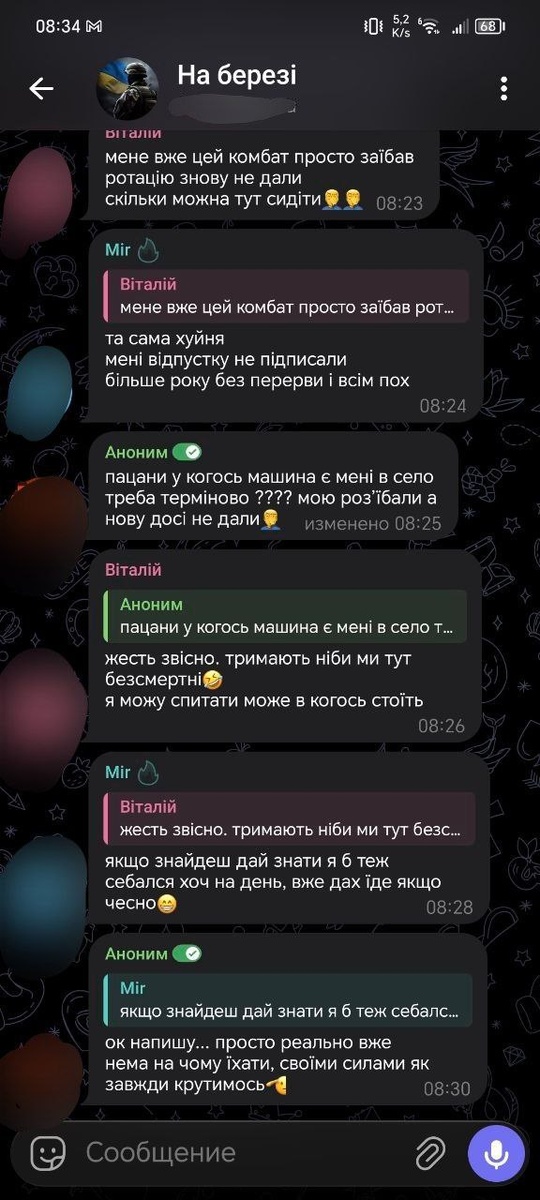 проблем не существует. 👉В солдатских чатах уже открыто пишут: « а зачем вообще такая служба». Люди на пределе. Ссоры в группах обычное дело, все из-за усталости и безысходности. Один третий месяц ждёт ротацию. Другому не дают отпуск. Третий прямо говорит — в подразделении банально нет транспорта. По словам военнослужащего, от которого получен скрин переписки, внутри подразделения постоянные конфликты: обвиняют друг друга, нервничают, срываются. Всё чаще звучат разговоры о том, как бы уйти в СЗЧ или «загаситься» через госпиталь. Когда командование игнорирует людей, оставляет их без отдыха, без ротации и без элементарного обеспечения — результат предсказуем. Боевой дух падает, доверие исчезает, каждый начинает думать только о том, как спасти себя. И если ничего не менять, дальше будет только хуже. 📱FREE KHERSON ⭐ НАШ ДЗЕН