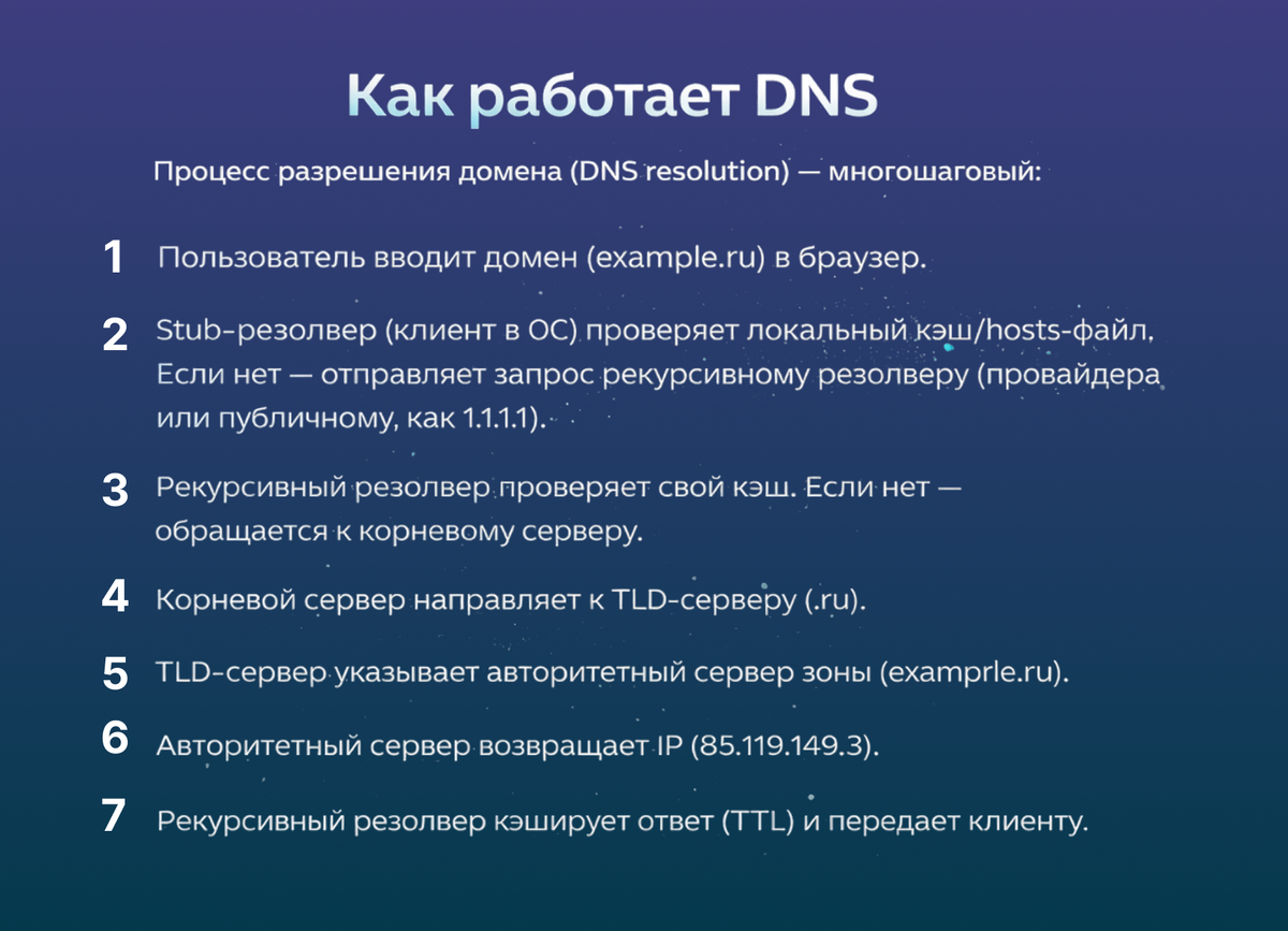 Процесс работы DNS начинается, когда вы вводите адрес сайта в браузер. Ваше устройство (Stub-резолвер) сначала проверяет локальный кэш или файл hosts на наличие сохраненной информации. Если ее нет, запрос передается рекурсивному резолверу — серверу, обычно предоставляемому вашим интернет-провайдером или публичным сервисом, таким как Google DNS. Этот резолвер последовательно обращается к иерархии серверов: сначала к корневым (root servers), затем к серверам доменов верхнего уровня (TLD, например, .com), и наконец к авторитетным серверам, где хранится точная информация об IP-адресе. Весь процесс занимает миллисекунды благодаря кэшированию данных, где результаты запросов сохраняются на определенное время (TTL — Time to Live). Только после того, как браузер получил IP-адрес, он устанавливает соединение. Если на любом из этих этапов произойдет сбой или намеренное искажение информации, вы просто не попадете на нужный ресурс.