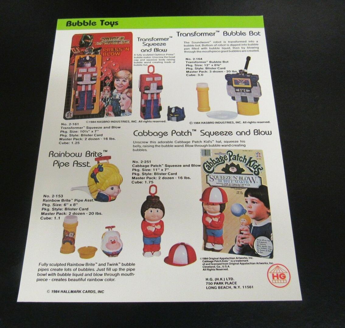 В прошлой статье мы рассмотрели в алфавитном порядке продукцию компаний с A по G, пока не исчерпалась квота на изображения. Соответственно, теперь продолжаем обзор с того места, на котором остановились. Компания HG Toys (в следующем году в Италии их продукцию будет выпускать фирма Litardi) произвела в 1984 году множество разнообразной продукции. Она включала мыльные пузыри в упаковке в форме Оптимуса и Саундвейва, фигурки Старскрима и Вилджека, прицепляемые на замок-молнию, прицепляемые на одежду значки с ними же, печати с Оптимусом, Старскримом, Джазом и Вилджеком, как отдельно, так и в наборе; печать в виде альтмода Джаза, боксёрские груши с Тандеркрекером и Скайварпом и соломинки с держателями в виде Оптимуса и Вилджека (изображение с Оптимусом оказалось слишком мелким и расплывчатым, так что мы не можем его прикрепить). Каталог включает также дверной звонок с Вилджеком и палатку с Тандеркрекером, но на самой продукции указан 1985 год, так что, вероятно, их не успели выпустить ранее