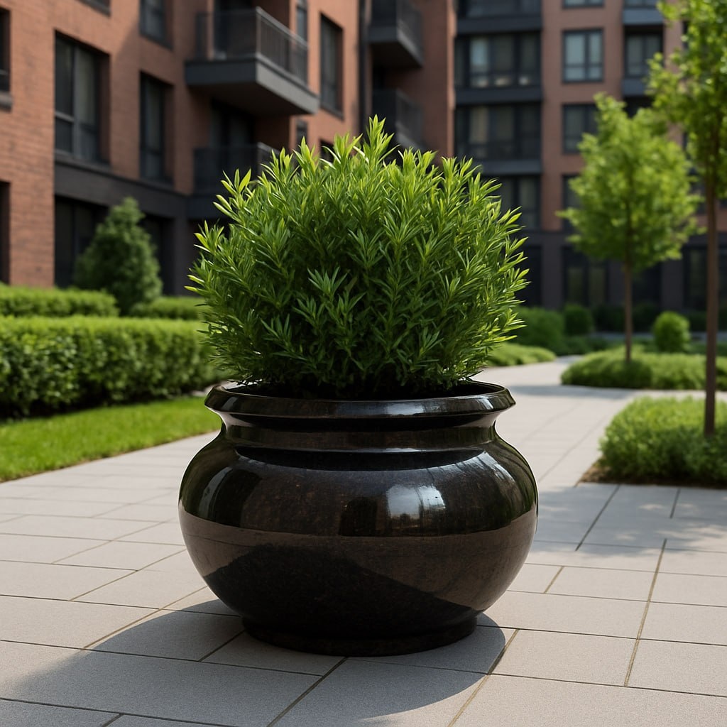 Черные гранитные вазоны становятся стильным акцентом в любом ландшафтном дизайне